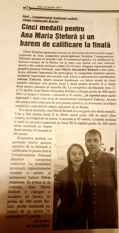 În vârstă de 13 ani, eleva antrenorului Cătălin Stan și a antrenorului coordonator Adrian Zaharia a cucerit numai puțin de 5 medalii la o competiție națională, dintre care una de aur, două de argint și două de bronz. Bilanțul este unul foarte bun, dacă ținem cont că fiica fostului mare jucător de volei Ștefan Ștefură a concurat în 6 probe la întrecerile de la Bacău, iar în 5 dintre ele a reușit să urce pe podium. Cu o experiență destul de bogată la competițiile naționale, cu peste 2 ani de pregătire și antrenamente în spate, Ana Maria Ștefură a lăsat deoparte toate emoțiile adunate de-a lungul timpului și a început în forță etapa regională de la Bacău, iar vineri, în prima zi de concurs, a reușit să obțină prima medalie, bronz în proba de 100 de metri fluture, cu timpul de un minut, 16 secunde și 72 de sutimi. Rezultatul din prima probă i-a dat și mai multă încredere tinerei sportive de la CS Delmadi, care ulterior, în cea de-a doua reuniune a cucerit alte două medalii. A fost argint în proba de 100 de metri liber, cu timpul de un minut, 06 secunde și 45 de sutimi, și bronz în una dintre cele mai grele probe ale acestui sport, cea de 200 de metri mixt, unde se înoată toate cele 4 stiluri. Aici, Ana Ștefură a înregistrat un timp de două minute, 44 de secunde și 50 de sutimi, rezultat cu care s-a calificat în prima fază a naționalelor de cadeți din vară. O altă medalie de argint a fost obținută în proba de 100 de metri spate, unde Ana Ștefură a fost foarte aproape de cea mai strălucită medalie, dar a fost întrecută de o sportivă de la Galați, Elena Sălăvăstru.